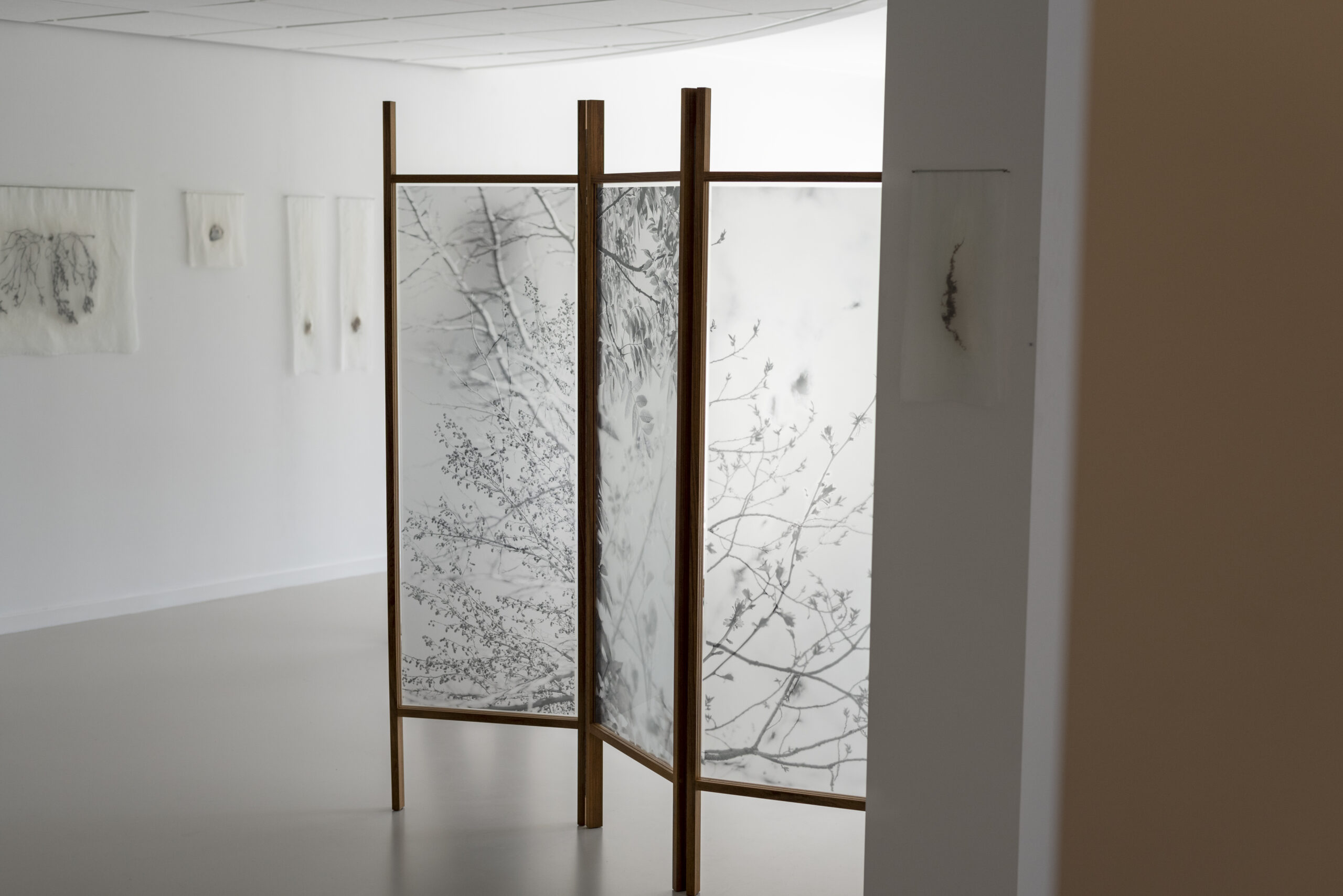 Kamerscherm in samenwerking met Jesse de Kam. Formaat van het fotografisch beeld 150cm x 140cm, drie panelen met scharnieren, hoogwaardig teakhout.